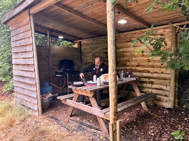Outside the tent you have a small covered kitchen area with gas bbq and picnic bench. Next to this there’s a fire pit area and a small shelter, perfect for kids to sit and roast marshmallows! Also two wooden sun loungers are available.